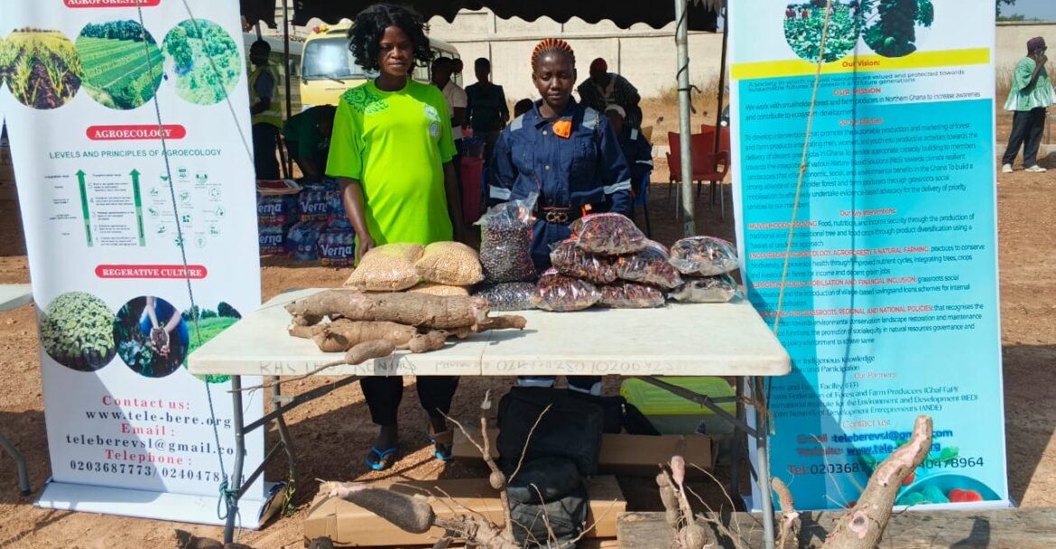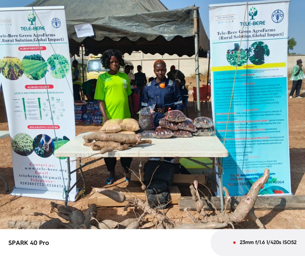 An exhibition stand by Tele-Bere Green AgroFarms displays value-added agricultural and forest products including processed grains, legumes, tubers, and dried products. The stand highlights agroecology, agroforestry, and regenerative farming practices, demonstrating how smallholder producers particularly women are adding value, improving market access and contributing to food security through climate-smart agriculture.