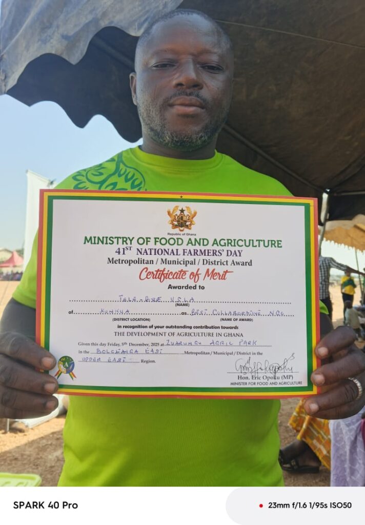 A representative of a forest and farm producer organization (Tele-Bere) proudly displays a Certificate of Merit awarded by the Ministry of Food and Agriculture during the 41st National Farmers’ Day celebrations. The award recognises outstanding contribution to agricultural development at the district level.